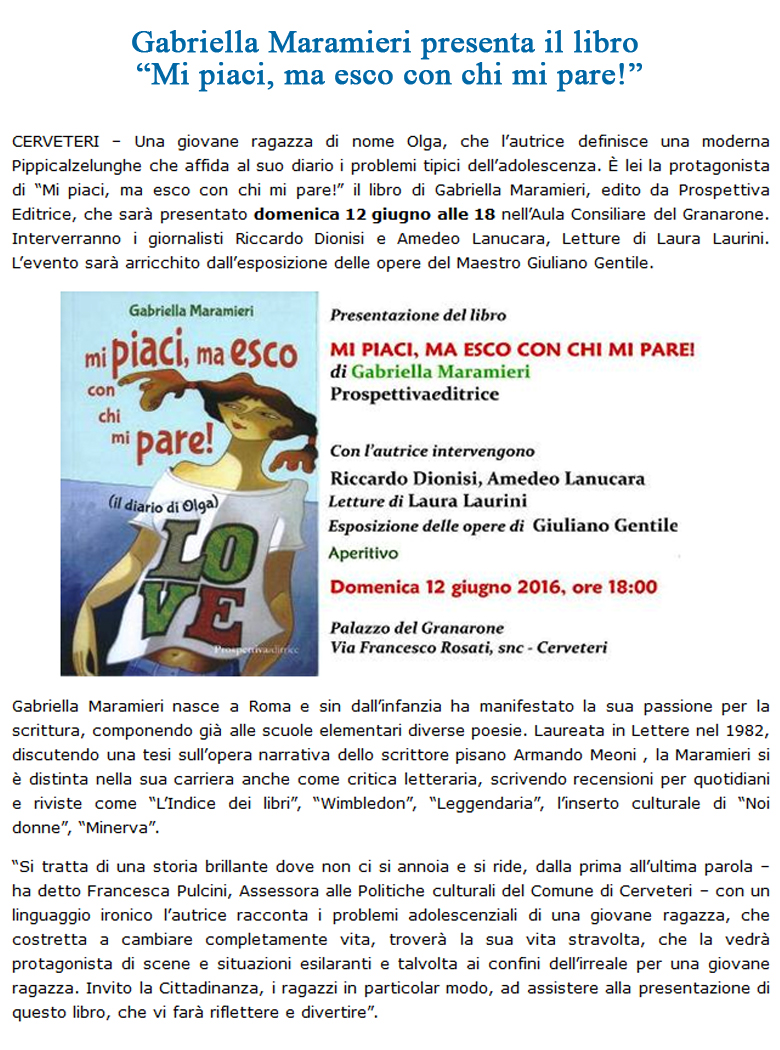 Una giovane ragazza di nome Olga, che l’autrice definisce una moderna Pippicalzelunghe che affida al suo diario i problemi tipici dell’adolescenza. È lei la protagonista di “Mi piaci, ma esco con chi mi pare!” il libro di Gabriella Maramieri, edito da Prospettiva Editrice, che sarà presentato domenica 12 giugno alle 18 nell’Aula Consiliare del Granarone. Interverranno i giornalisti Riccardo Dionisi e Amedeo Lanucara, Letture di Laura Laurini. L’evento sarà arricchito dall’esposizione delle opere del Maestro Giuliano Gentile.