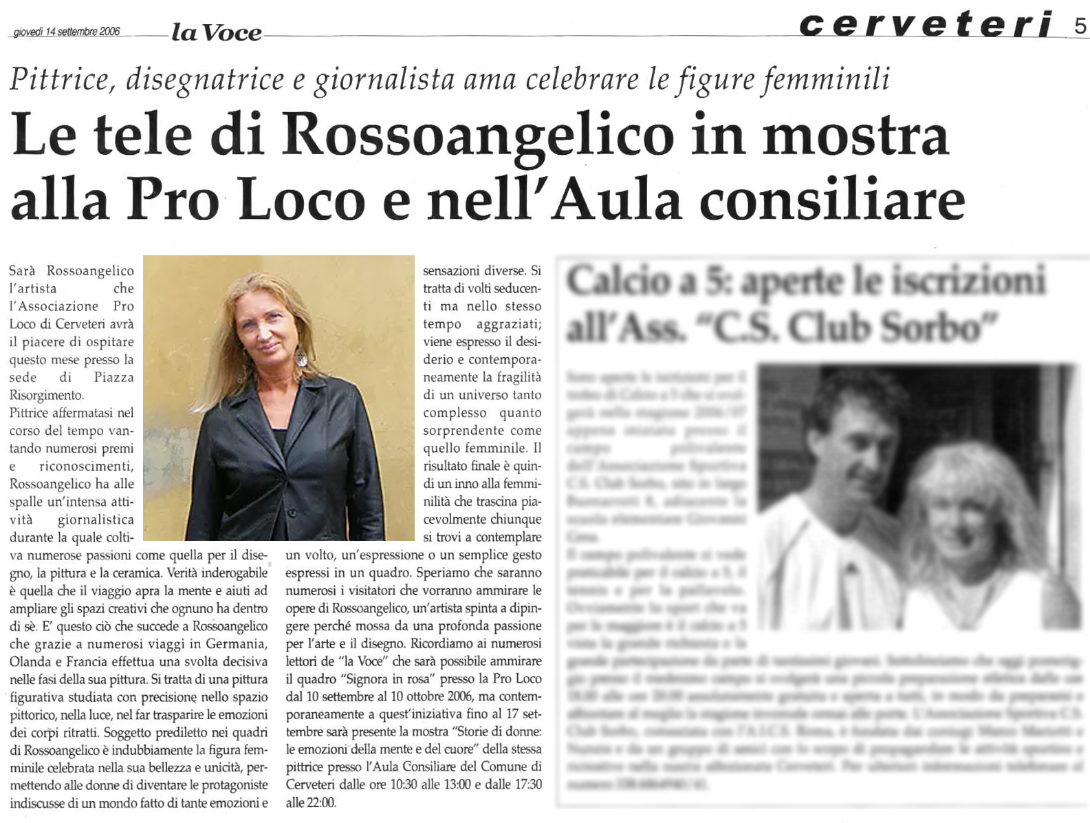 Sarà Rossoangelico l’artista che l’Associazione Pro Loco di Cerveteri avrà il piacere di ospitare questo mese presso la sede di Piazza Risorgimento. Pittrice affermatasi nel corso del tempo vantando numerosi premi e riconoscimenti. Rossoangelico ha alle spalle un’intensa attività giornalistica durante la quale coltiva numerose passioni come quella per il disegno, la pittura e la ceramica. Verità inderogabile è quella che il viaggio apra la mente e aiuti ad ampliare gli spazi creativi che ognuno ha dentro di sé. È questo ciò che succede a Rossoangelico che grazie a numerosi viaggi in Germania, Olanda e Francia effettua una svolta decisiva nelle fasi della sua pittura. Si tratta di una pittura figurativa studiata con precisione nello spazio pittorico, nella luce, nel far trasparire le emozioni dei corpi ritratti. Soggetto prediletto nei quadri di Rossoangelico è indubbiamente la figura femminile celebrata nella sua bellezza e unicità, permettendo alle donne di diventare le protagoniste indiscusse di un mondo fatto di tante emozioni e sensazioni diverse. Si tratta di volti seducenti ma nello stesso tempo aggraziati; viene espresso il desiderio e contemporaneamente la fragilità di un universo tanto complesso quanto sorprendente come quello femminile. Il risultato finale è quindi un inno alla femminilità che trascina piacevolmente chiunque si trovi a contemplare un volto, un’espressione o un semplice gesto espressi in un quadro. Speriamo che saranno numerosi i visitatori che vorranno ammirare le opere di Rossoangelico, un’artista spinta a dipingere perché mossa da una profonda passione per l’arte e il disegno. Ricordiamo ai numerosi lettori de “la Voce” che sarà possibile ammirare il quadro “Signora in rosa” presso la Pro Loco dal 10 settembre al 10 ottobre 2006, ma contemporaneamente a quest’iniziativa fino al 17 settembre sarà presente la mostra “Storie di donne: le emozioni della mente e del cuore” della stessa pittrice presso l’Aula Consiliare del Comune di Cerveteri dalle ore 10:30 alle 13:00 e dalle 17:30 alle 22:00.